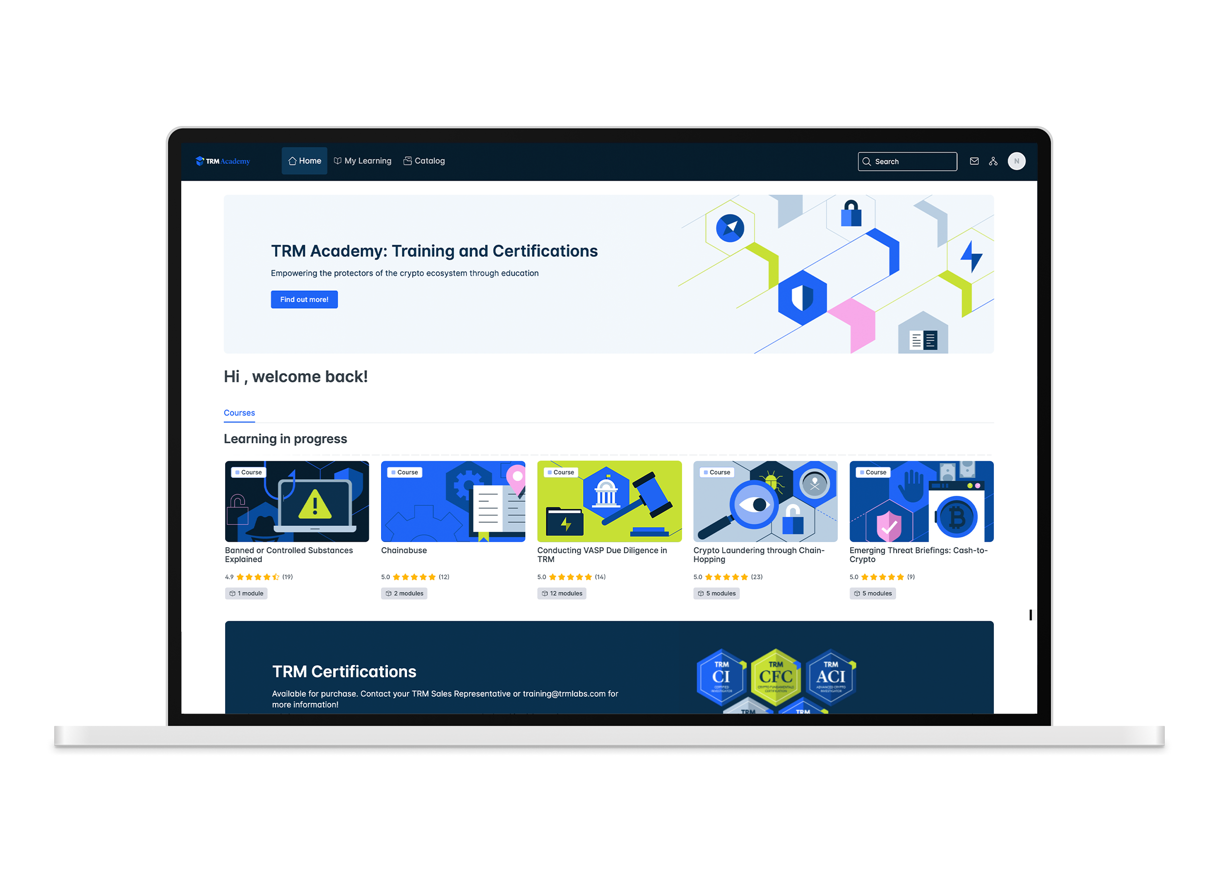 Art direction for the refresh of TRM Academy’s user portal. TRM Academy is an e-learning resource for certification courses delivered fully online to help users become crypto experts. I facilitated translating the Academy team’s goals and asset requests, created badges for e-learning gamification, and updated sales and promotional materials.